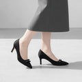 抜け感のある甲のデザインとダブルリボンがエレガントな1足。ドレスやオケージョンシーンに最適なきれいめパンプスです。